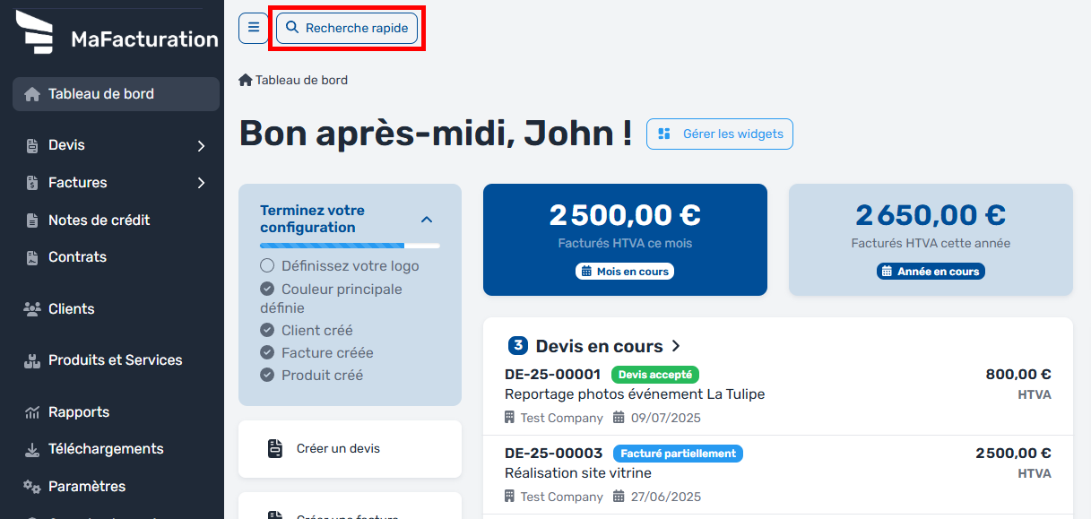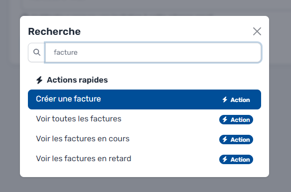 La barre de recherche rapide de MaFacturation est un outil qui vous permet de trouver rapidement ce que vous cherchez dans l'application. Voici comment l'utiliser :