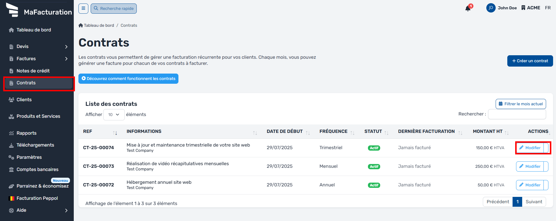- Modifier : pour ajuster les détails du contrat (client, fréquence, montant, statut, etc.).