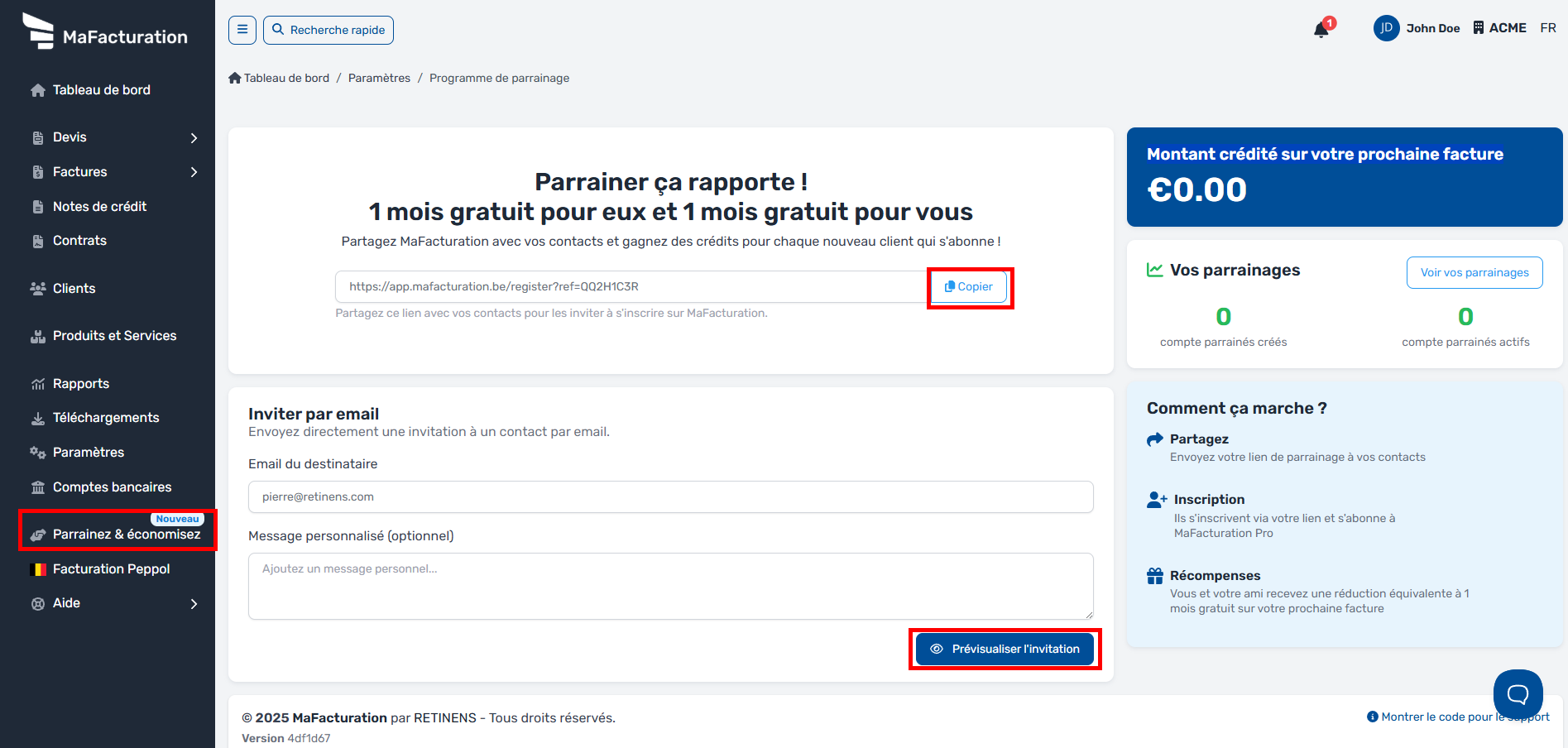 Dans le menu latéral gauche, cliquez sur Parrainez & économisez pour ouvrir l’espace dédié au parrainage.