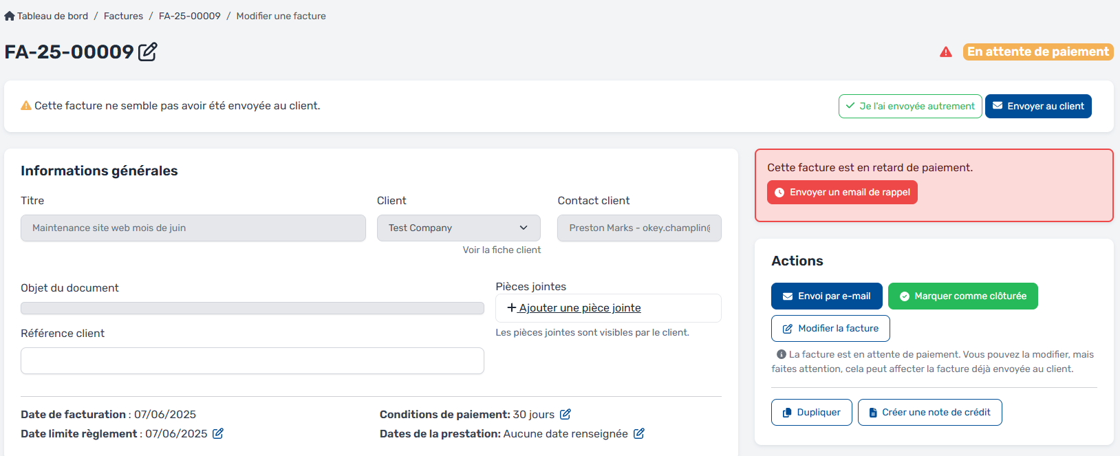 💡 Astuce : Le rappel peut être envoyé manuellement à tout moment, que la facture ait quelques jours ou plusieurs semaines de retard.
