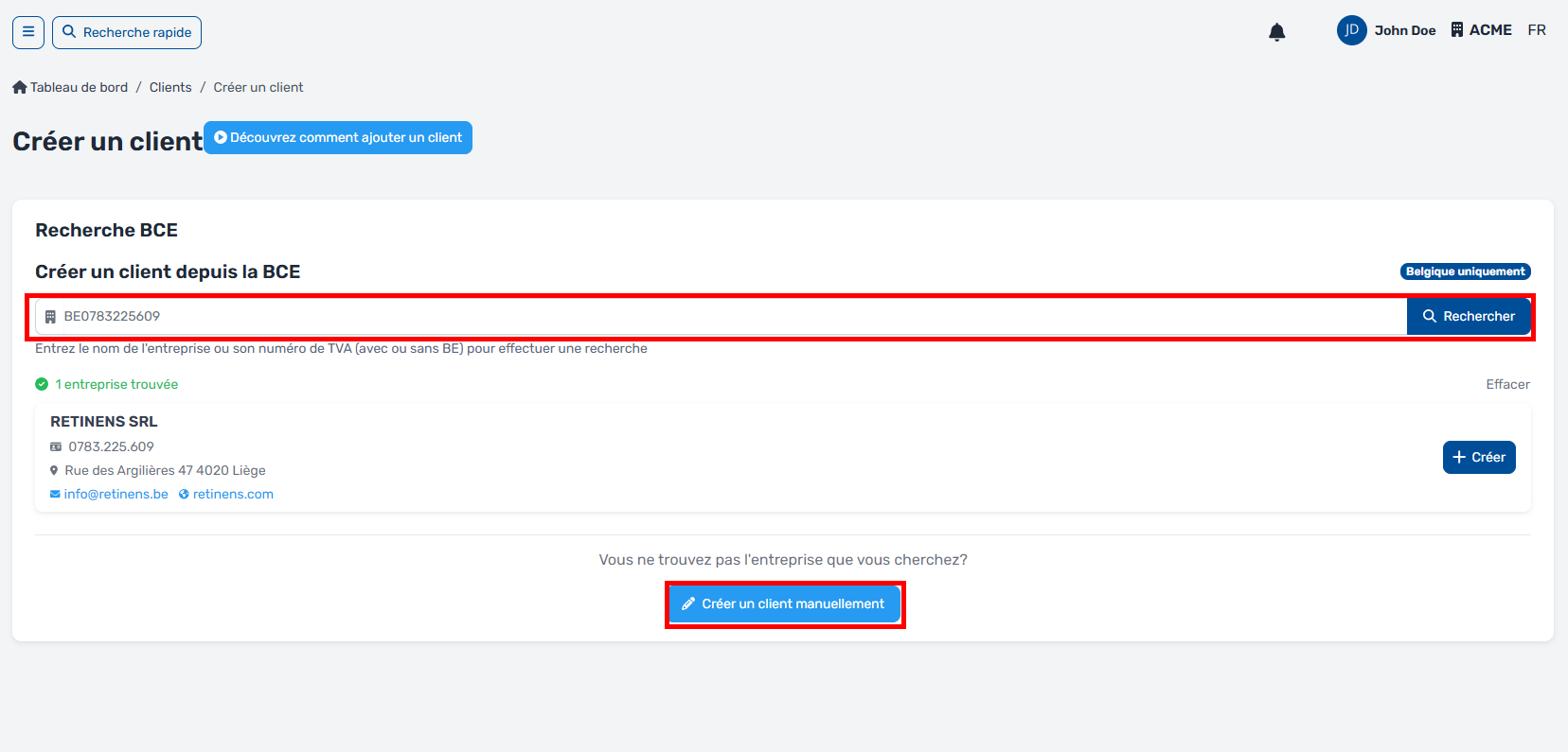 - Vous pouvez rechercher le nom de son entreprise ou son numéro de TVA dans la barre de recherche et notre système recherchera et importera les données directement depuis la base de données de la BCE. Cette base est mise à jour 1 fois par mois, il se peut que des entreprises récemment créées ne soient pas reprises.