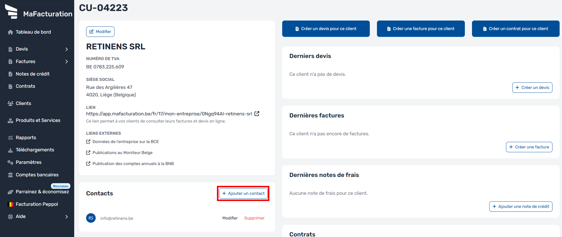 Ensuite, pour ajouter un autre contact, rendez-vous sur la fiche client, et cliquez sur le bouton sous la liste des contacts et remplissez le formulaire affiché.