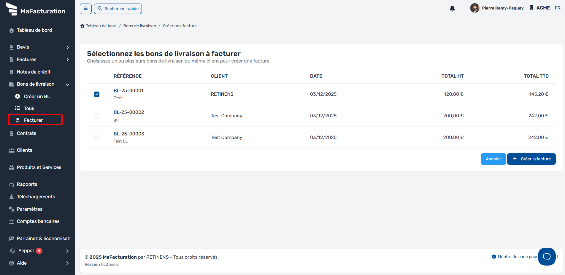 - Sélectionnez le Bon de livraison que vous souhaitez facturer.